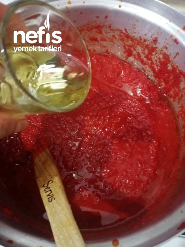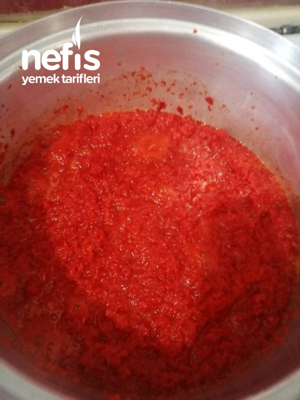 - Çektiğiniz kapya biberi derin tencere koyup pişirin. Göz göz olunca salçayı ekleyip kokusu çıkana kadar pişirin. Sürekli karıştırın yoksa çok sıçrıyor.