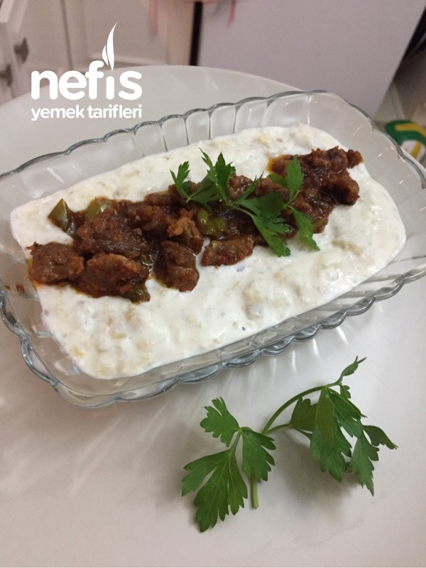 7. Patlıcanları dökelim karıştıralım, servis tabağına yoğurtlu patlıcanı alalım.