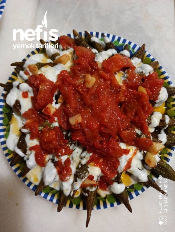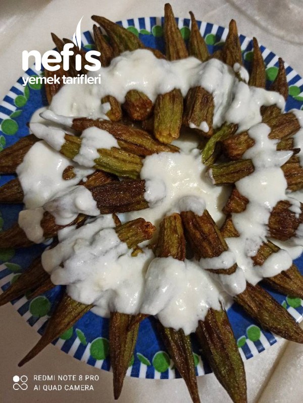 - Kızaran bamyaları servis tabağına alın üzerine yoğurt ve sos ilave ederek servis yapın. Afiyet olsun.