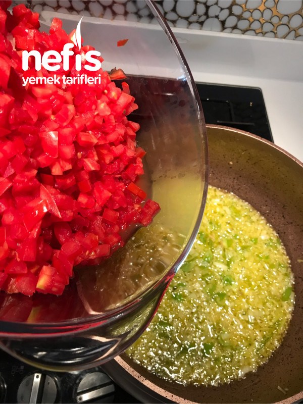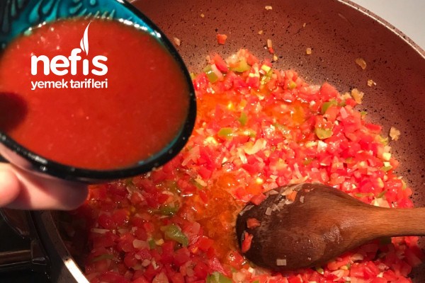 5. Domateslerimizi minik minik doğruyoruz sosumuza ekliyoruz üzerine de sulandırdığımız salçayı ve ezdiğimiz sarımsakları ekliyoruz.