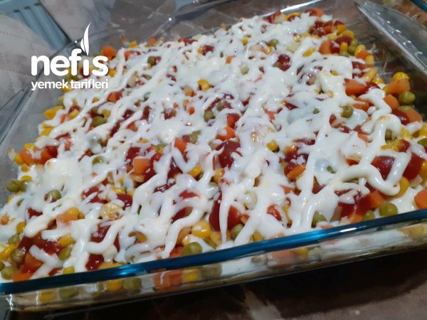 - En son ketçap mayonez sıkılıp bir ince katman daha kaşar serilir. Fırına verilir. Afiyet olsun:).