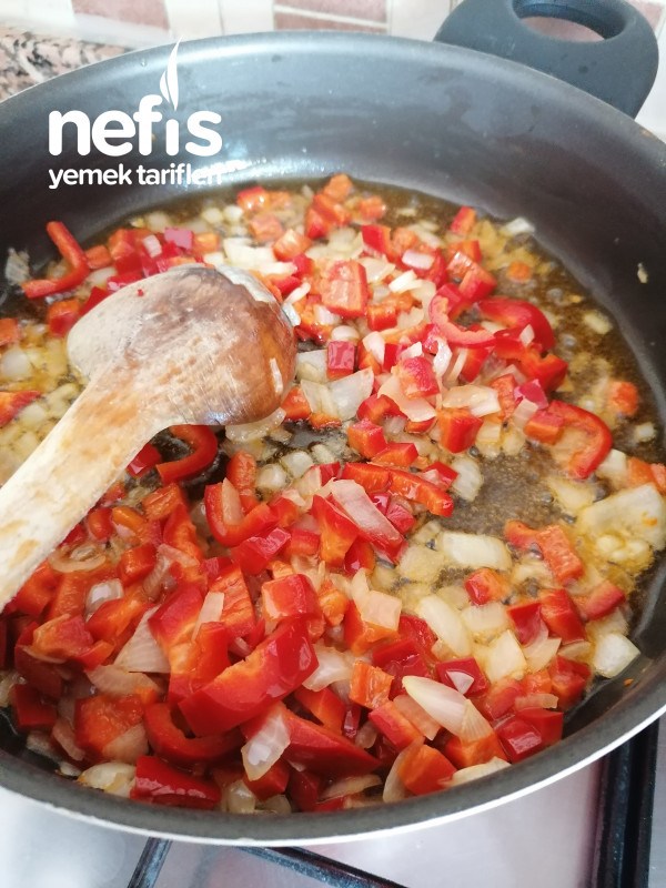 - Önce soğanı yağla kavuralım, üzerine biberleri ekleyelim.