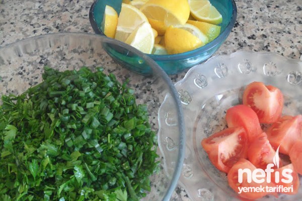- Öncelikle malzemelerimizden yeşil soğan, maydanoz güzelce yıkanır ince ince küçük küçük doğranır.