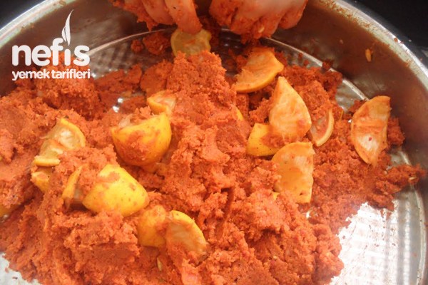- Daha sonra dörde bölünmüş limonlar katılır, on dakika daha yoğurulur. İçi çıkan limonların kabukları alınır.