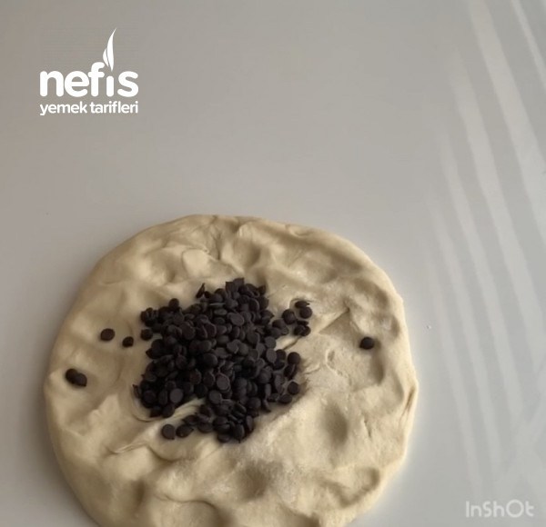 - Tezgaha alıp hafif elinizle açın, ortasına damla çikolatayı dökün ve hızlıca çikolatalar erimeden karışana kadar yoğurun.