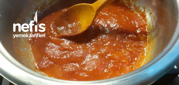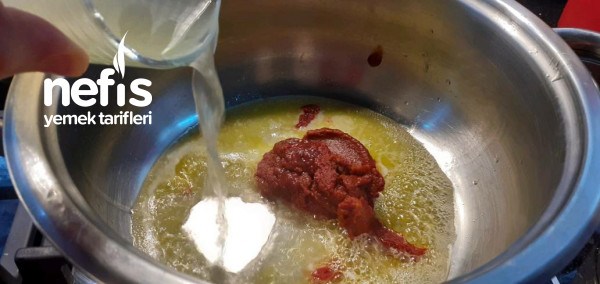 - Tencereye sıvı yağ, tereyağı, salça, tuz ve makarna suyunu döküp iyice karıştıralım.
