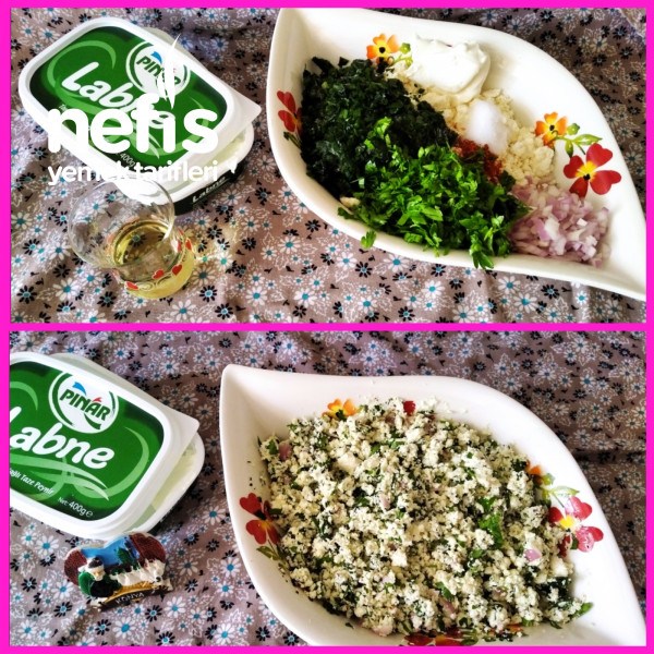 2. Bu arada iç malzemelerimizi karıştırıyoruz, labneyi ekledikten sonra güzelce karıştırmak gerekiyor çünkü labne yumuşak, diğerleri ile topak topak kalmaması bütün harca eşit dağılması için.