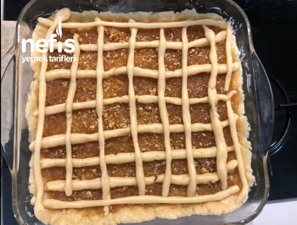 - Spatulayla düzlüyoruz ve üzeri için ayırdığımız hamurdan ince şeritler halinde enlemesine ve boylamasına yapıyoruz.