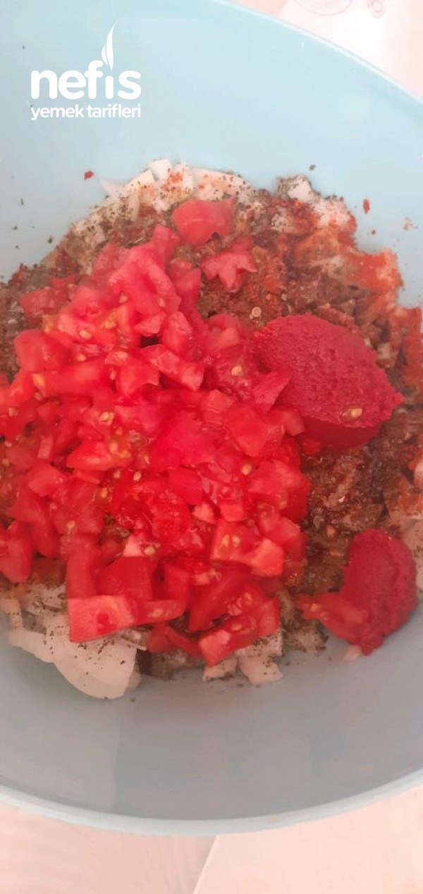 - Domatesimizi küçük küçük doğrayalım harcımıza ekleyelim.