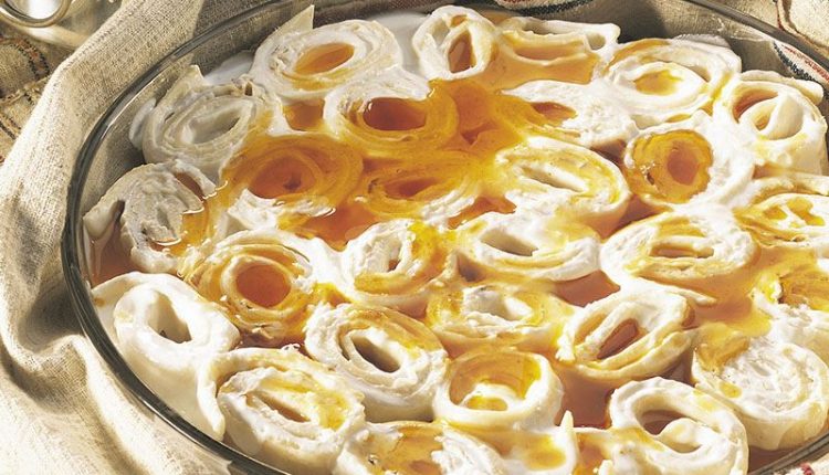 Hamurdan bezeler koparıp orta kalınlıkta yufkalar açın. Yufkaları sac üzerinde pişirin. Rulo şeklinde sarıp ikişer santim arayla kesin. Ruloları dik olarak geniş ve derin kenarlı bir kaba yan yana sıkıca dizerek yerleştirin.