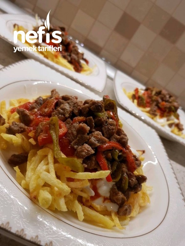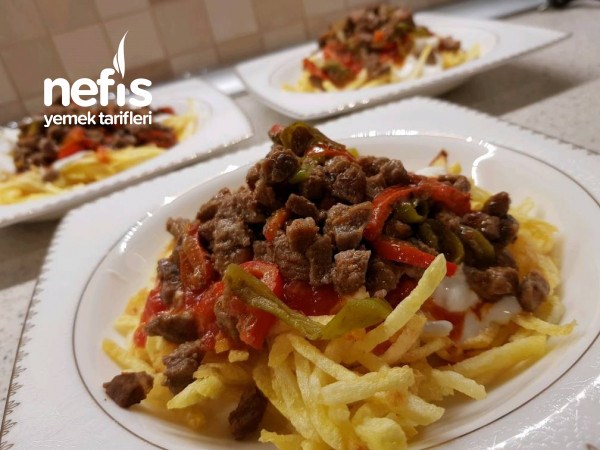 - Görselde görüldüğü gibi alta patates üzerine sarımsaklı yoğurt üzerine domates sos onun da üzerine etimizi ekleyelim.