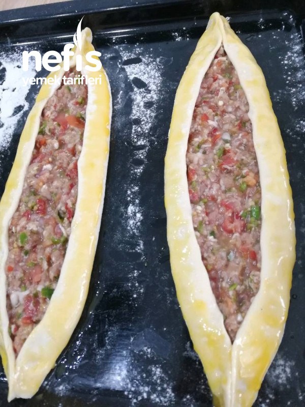 - İç malzeme için biber domates, soğan ince doğrayıp ,kıyma ,baharatlarını, yağını, tuzunu ekleyip iyice karıştırıp hamuru uzununa açıp içine kıymadan koyup kenarlarını kapayıp un serpilmiş tepsiye hamurları koyup katlanan yerine yumurta sarısı sürelim.