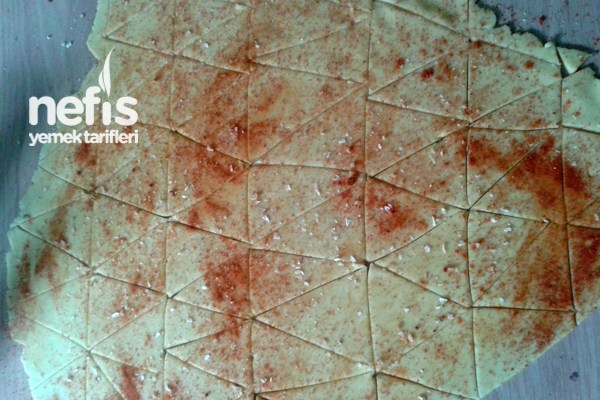 Sonra tezgahın veye masanın üzerine un serpip ince bir şekilde açıyoruz. (Çok fazla ince açarsanız yırtılır) Üzerine baharatları serpiyoruz. İstediğiniz şekli verip yağlı kağıt serilmiş fırın tepsisine diziyoruz. 200 derecede 3-6 dk pişiriyoruz. Kontrol edin çabuk yanabilir. Afiyet olsun.