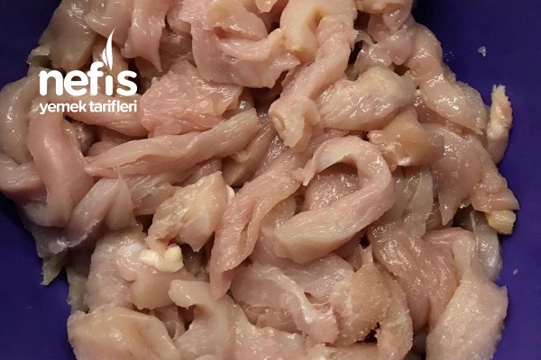 - Tavuğu jülyen doğrayıp üzerine soda ,yumurta, kabartma tozu, tuz ve tozbiber ekleyip karıştırıyoruz.