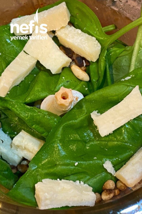 - Fesleğen yapraklarını, kavurduğumuz çam fıstıklarını, peynir ve çok az zeytinyağı ile rondodan geçirdim.