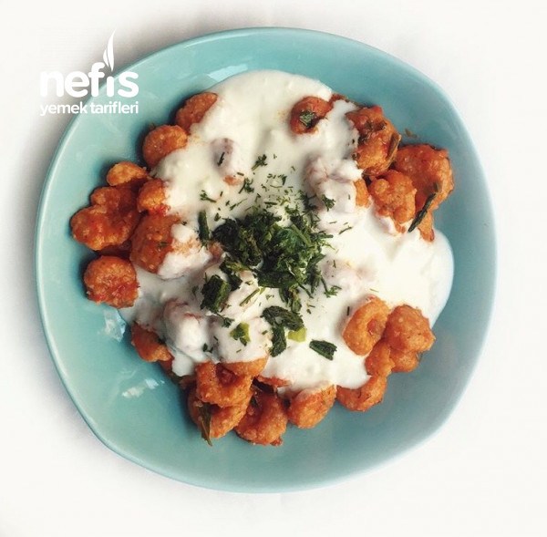 - Daha sonra nane ekleyip haşlanan köftelerimizle karıştırarak bir tabağa alıp sarımsaklı yoğurt ile servis ediyoruz .
