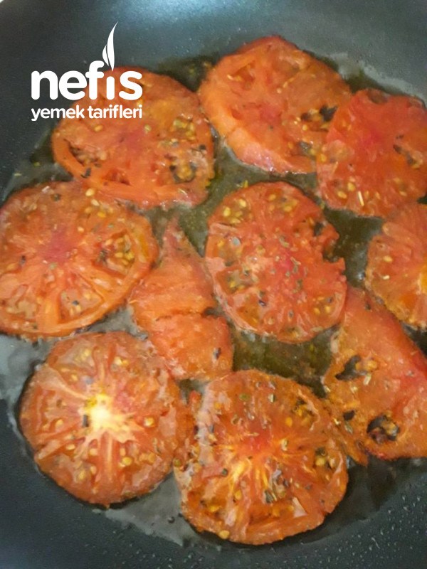 - Domatesi halka halka doğrayıp tavaya sıralayın üzerine yağı gezdirip kapağını kapatın. Orta ateşte hiç karıştırmadan 15 dk pişirin.