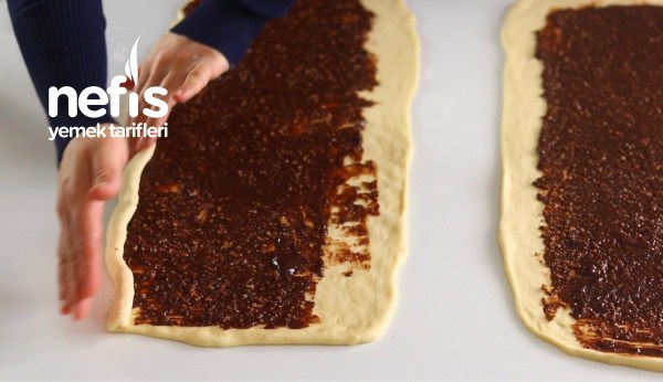 - Her parça merdaneyle dikdörtgen biçimde açılır. İki parçaya da her yerine gelecek şekilde fındıklı harç sürülür.