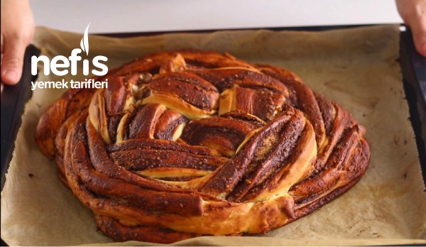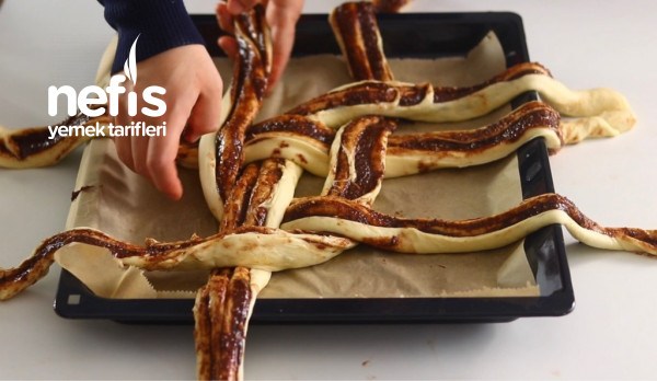 - Parçalar görseldeki (videodaki gibi) fırın tepsisinin üzerine alınır ve şekildeki gibi örülerek, yuvarlak form verilir.