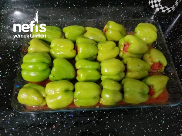 - Biberler doldurulur üzerine domates dilimlenir kapak yapılır.