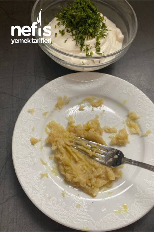 - Sarımsağı kabuğundan çıkartıp çatal yardımıyla ince ezelim bir kase yoğurt içersine koyup biraz dereotu ekleyip patateslere birlikte servis edin.