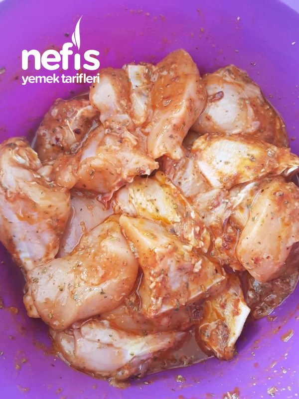 2. Pulbiber, kekik, sıvı yağ, su ve tuzu güzelce karıştırıp tavuğumuzla harmanlayalım.