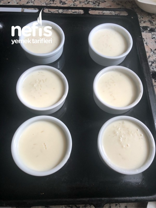 11. Kaseleri fırın tepsimize yerleştirelim, kaselerin yarısına gelecek şekilde tepsiye suyumuzu koyalım. (üzerine şeker veya soğuk süt eklersek daha güzel kızarır).