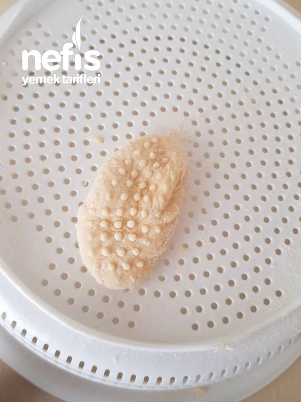 - Hamurdan ceviz büyüklüğünde parçalar alınarak bir kevgir üzerine bastırılır.