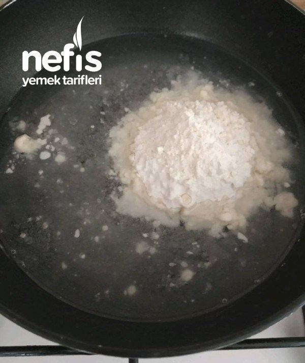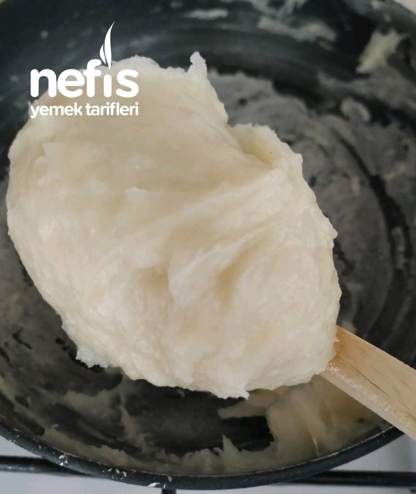 1. ????‍???? 10 gram un ve 50 gram su yapışmaz tavada yoğun kıvama gelene kadar karıştırılır. Bir kaba alınır, üstü kapatılarak oda sıcaklığına gelmesi beklenir.