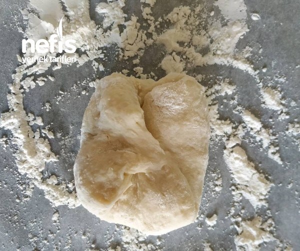 5. ????‍???? hamur üstü örtülerek bir saat bekletilir. Ardından altı parçaya bölünür ve unlu zeminde zarf şeklinde katlanarak beze yapılır.