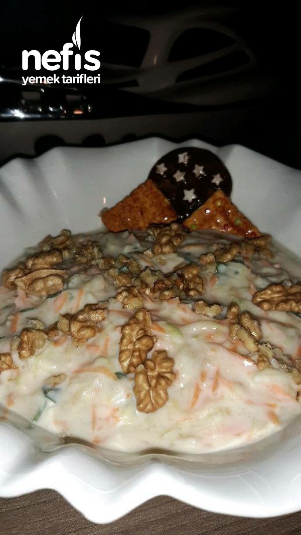 5. En son havuç ile kabak rendesi, maydanoz ve cevizleri yoğurtlu karışıma boşaltıp güzelce bir karıştıralım.