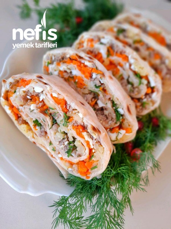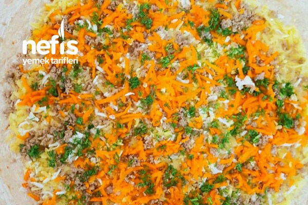 - Haşlanmış havucu da kıymanın üzerine rendeledikten sonra kişnişi dökün ve rulo gibi dikkatlice katlayın.