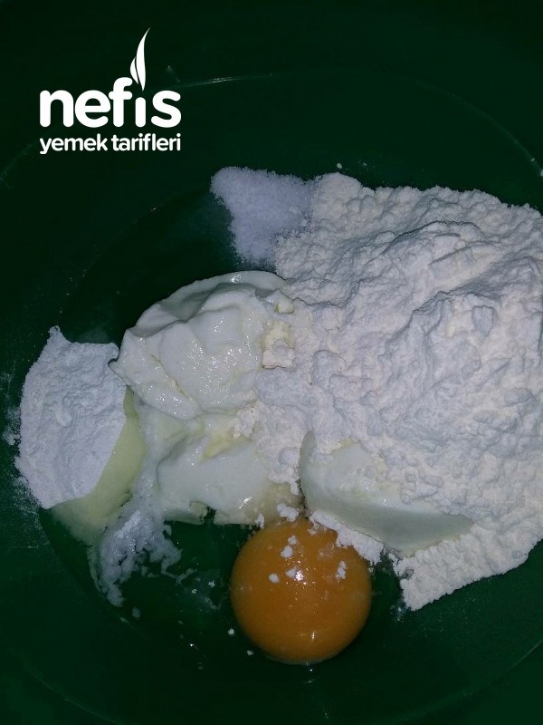 1. Yumurtayı, yoğurdu ,un ,tuz bir çorba kaşığı sıvı yağ, kabartma tozunu iyice yoğuralım.