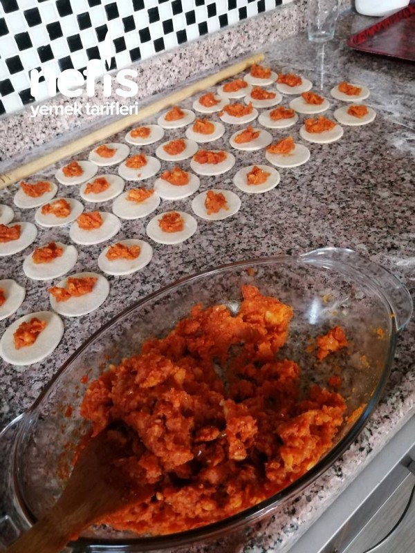 - Bu esnada dinlenen hamuru ince açıp su bardağı yardımıyla yuvarlaklar elde edin patatesli iç harcı yuvarlakların içine katıp hamurları kapatalım.