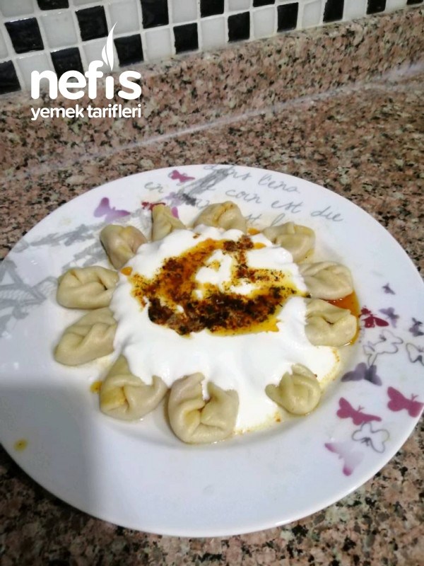 - Haşlanmış mantılarımızı servis tabağına alıp üzerine sarımsaklı yoğurt ve tereyağlı sostan döküp servis edebilirsiniz. Afiyet olsun ????.