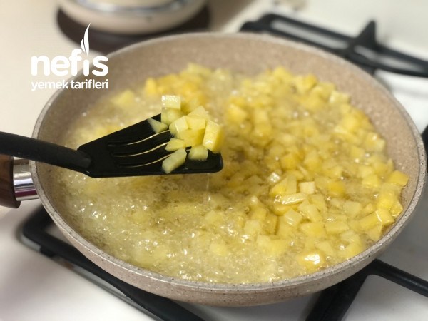 - Patatesler yaklaşık 1 su bardağı yağda kızartılıp kenara alınır.