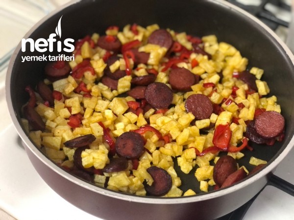 - Az yağda doğranmış biberler tavada çevrilir, hafif kızarınca sucuk eklenip rengi dönene kadar karıştırılır.