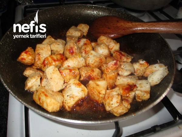 - Diğer tarafta tavaya iri kuşbaşı doğradığımız tavuk etlerini alalım biraz 5 dakika yağsız kavuralım.