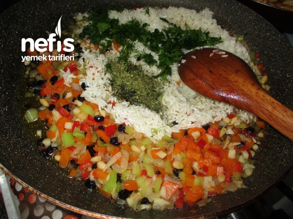 - Ilık tuzlu suda bekletip yıkayıp süzdüğümüz pirinci ilave edelim karıştıralım 1 su bardağı su dökelim suyu çekene kadar kısık ateşte pirinci pişirelim.