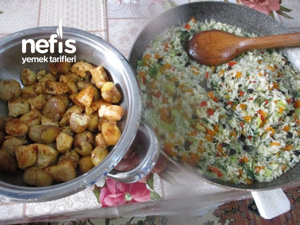 - Not: Ayrı servis etmek istiyorsanız bir küçük tabağı sudan geçirelim tavuklu kestaneli içi koyalım üzerine pilavı koyalım bastıralım servis tabağın ters çevirelim bütün olarak istiyorsanız sofraya ortaya getirebilirsiniz.