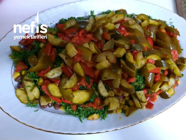- Salatalık turşusu ve konserve mısırı koyup harmanlıyoruz.
