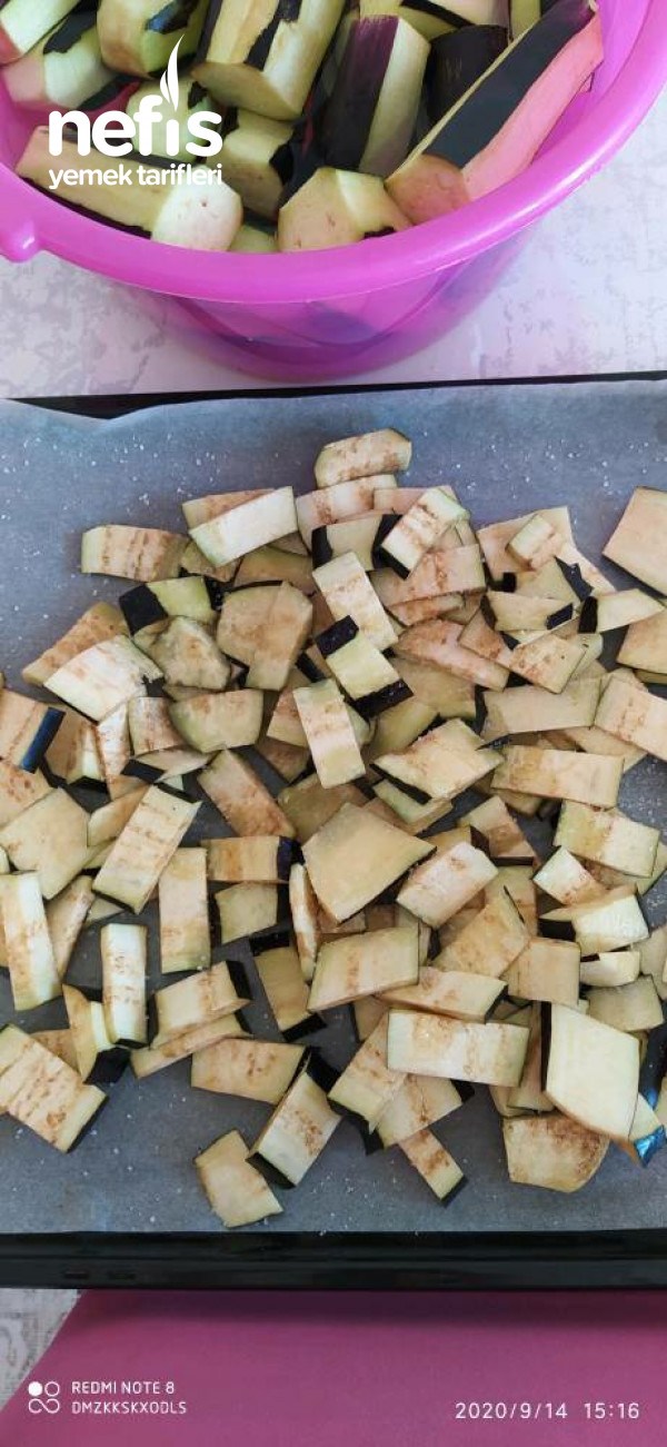 - Patlıcanları alacalı soyup tuzlayıp yağ döküp yağlı kağıt serili fırın tepsisine koyun biberler de aynı şekilde.