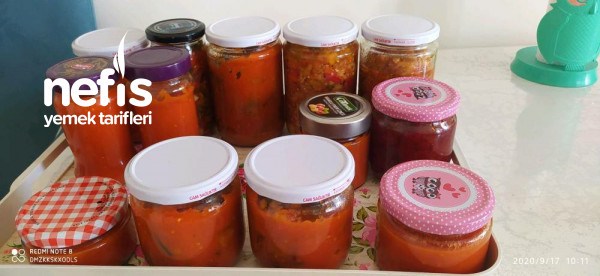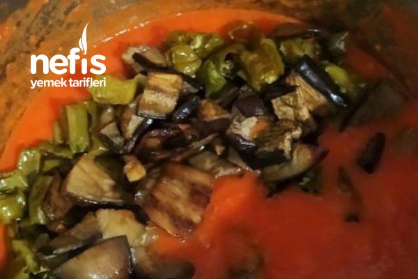 - Ben bir kısmını bu şekilde sos yapıp kaldırdım. Kalan kısmına fırındaki patlıcan ve biberleri ekleyip kavanozladım.