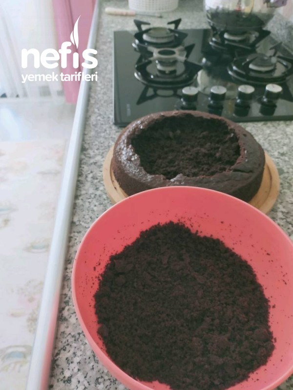 - Kek soğuyunca kenarı havuz gibi kesilip kaşık yardımıyla yarıya kadar oyulur.