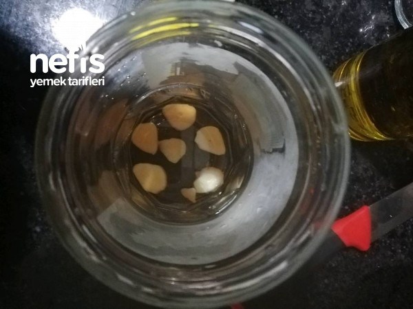 - Kavanozun en altına sarımsağın bir tanesini dilimleyin ve üzerine üzüm sirkesini ilave edin.