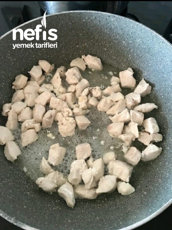 1. Tavukları küp küp doğrayarak kendi suyunda pişiriyoruz.