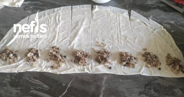 - Yufka dikey olarak sekiz parçaya bölünür. Her parçanın başına kıymalı harçtan koyulur. Üçgen şeklinde katlanır.