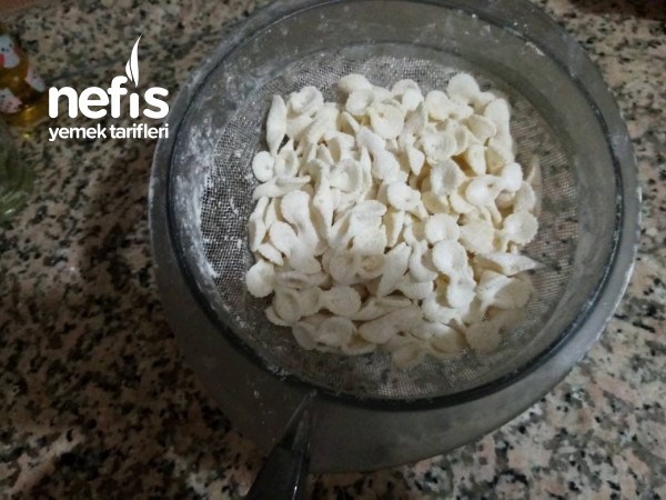- Makarnayı 10 dk haşlayıp soğuk suya tutun suyu iyice süzüldükten sonra un ve nişasta karışımına bulayın iyice her yerini fazla unu ince bir süzgeçten eleyin.