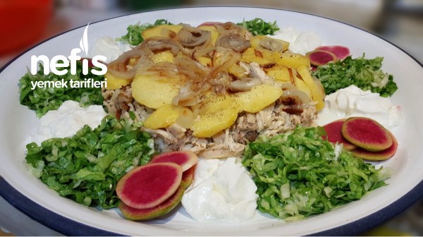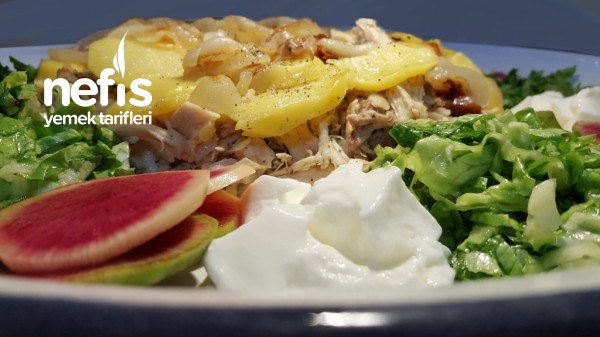 - Soğanların üzerine kızartılmış patateslerimizi onların üzerine de tavuğu tavuğun üzerine pirinçi döküyoruz.