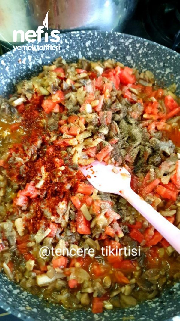 - Suyunu salıp sonra çekince üzerine yine küçük doğradığımız domatesleri ekleyip tuz,karabiber ve pulbiberi damak tadınıza göre ilave edelim.